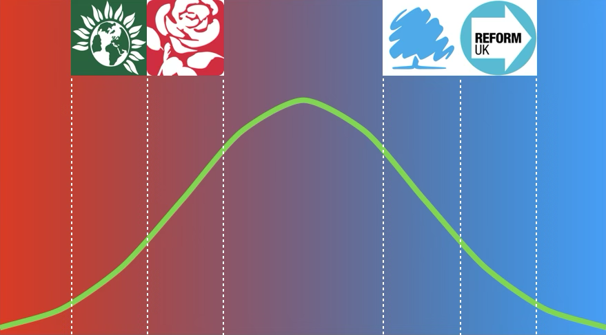Take the typical left to right political spectrum and approximate the location and range of the political parties.
