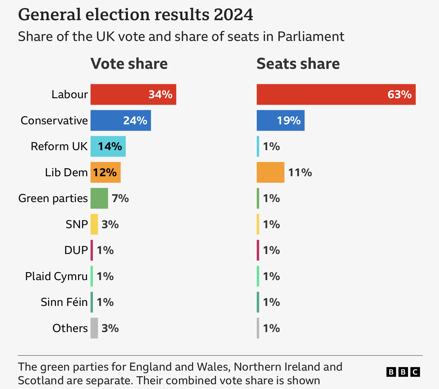 According to the BBC Labour received 34% of the public vote and 63% of the seats in parliament. Meanwhile Reform got 14% of the vote but only 1% of the seats.